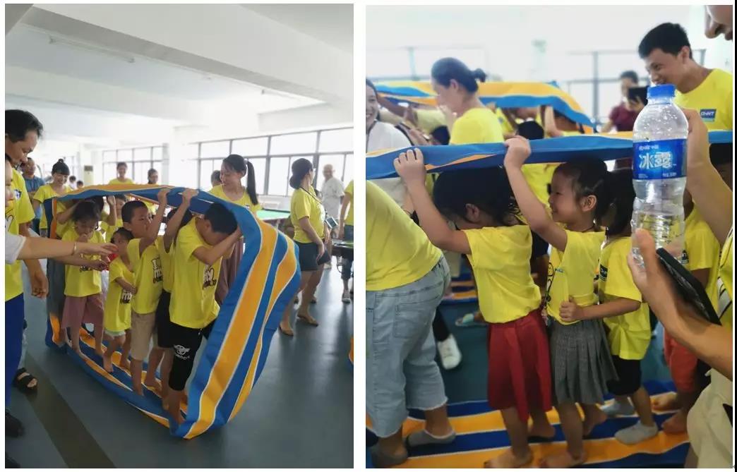 隨后,活動在一場歡快的“兔子舞”中拉開了序幕,本次活動設(shè)置了 “過河拆橋”、“無敵風(fēng)火輪”、“投籃高手”等系列趣味小游戲。在活動中,家長和孩子們密切配合,整個現(xiàn)場處處洋溢著家長和孩子們的歡聲笑語,全員為孩子們加油喝彩,助威鼓勁,活動中最別具一格的游戲是“無敵風(fēng)火輪”,由于擋住了前方視線,孩子要有基本的方向意識,游戲有一定的難度,在旁觀看的爸爸媽媽們即是激動又是緊張,在爸爸媽媽們的幫助和指導(dǎo)下孩子們順利完成游戲任務(wù),最后家長們也積極興奮的PK挑戰(zhàn),體驗孩子們的樂趣、童真。